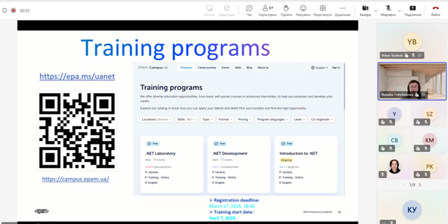 24 березня 2026 року відбулася онлайн-зустріч представників компанії-лідера ІТ-галузі України EPAM зі студентами Дніпровського металургійного інституту та Дніпровського інституту інфраструктури і транспорту Українського державного університету науки і технологій. Захід було організовано з метою ознайомлення студентів із сучасними тенденціями ІТ-галузі, можливостями працевлаштування та особливостями побудови кар’єри у провідній міжнародній компанії. Під час зустрічі спікери надали актуальну інформацію про діяльність компанії, а також поділилися практичними порадами щодо старту кар’єри в ІТ без попереднього досвіду. Особливу увагу було приділено таким напрямам, як Front-End та Back-End розробка, Java, .NET, DevOps, а також тестування програмного забезпечення (QA, AQA, PT). У межах заходу учасники мали можливість: дізнатися про вимоги до початківців у сфері ІТ; ознайомитися з ключовими технологіями та напрямами розвитку; отримати рекомендації щодо навчання та саморозвитку; поставити запитання фахівцям компанії під час Q&A-сесії. Проведення подібних заходів є важливим елементом професійної орієнтації студентів, адже дозволяє налагодити зв’язок між освітою та реальними потребами ІТ-ринку, а також мотивує молодь до подальшого розвитку та вдосконалення своїх професійних навичок. Вдячні компанії EPAM за сприяння розвитку молодих фахівців в сфері інформаційних технологій.