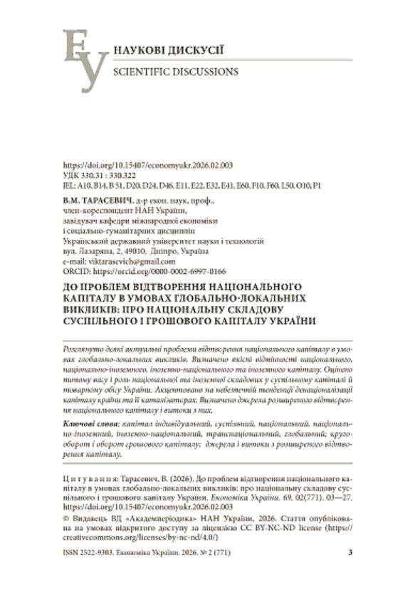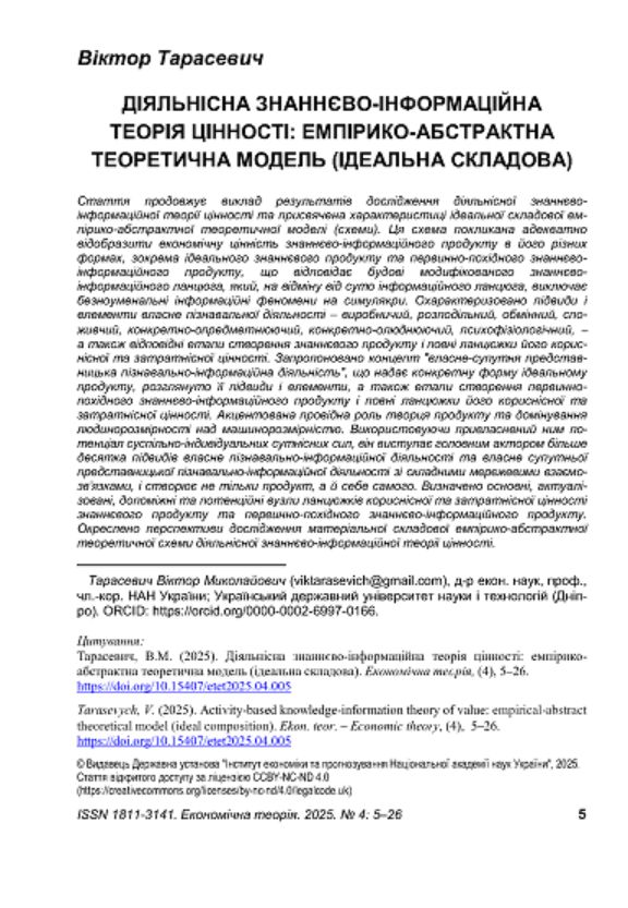 В журналі "Економіка України" опублікована стаття "До проблем відтворення національного капіталу в умовах глобально-локальних викликів: про національну складову суспільного і грошового капіталу України", а в журналі "Економічна теорія" -- стаття "Діяльнісна знаннєво-інформаційна теорія цінності: емпірико-абстрактна теоретична модель (ідеальна складова)".