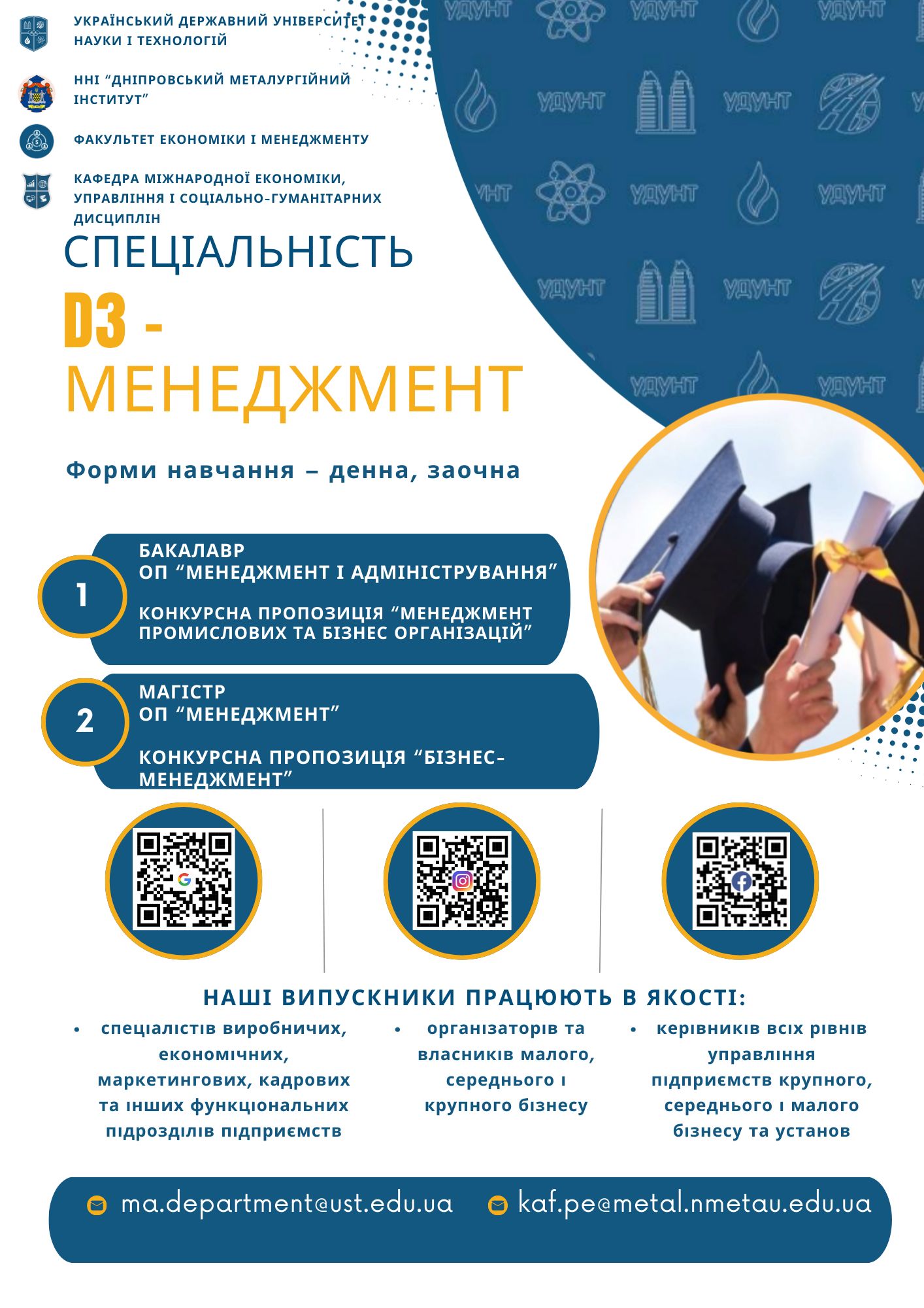 5. Спеціальність: «D3 Менеджмент». Назва пропозиції: «ДМетІ_Менеджмент». Освітня програма: «Бізнес-менеджмент». Другий (магістерський) рівень вищої освіти Вгору: Вступ 2026. Абітурієнту