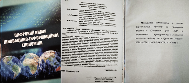 У межах Європейського проєкту за програмою Erasmus+ «Посилення ролі ЗВО в промисловій трансформації в контексті парадигми Industry 4.0 в Грузії та Україні» ( 609939-EPP-1-2019-BE-EPPKA2-CBHE-J) підготовлено та видано колективну монографію «Цифровий вимір інноваційно-інформаційної економіки: монографія / Тарасевич В.М., Білоцерківець В.В., Завгородня О.О., Лебедєва В.К. та ін.; за ред. В.М. Тарасевича. Дніпро: ПМП «Економіка», 2021. 448 с. »