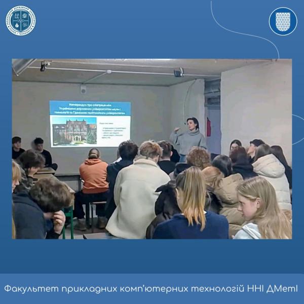 28 січня 2026 року на базі Дніпровського ліцею №139 було проведено профорієнтаційний захід для учнів старших класів. Під час заходу відбулося спілкування майбутніх вступників із представниками кафедри економічної інформатики — доцентами Підгорною К.Д. та Удачиною К.О., які надали інформацію про особливості здобуття вищої освіти в університеті, освітню діяльність факультету та умови вступної кампанії 2026. Висловлюємо подяку адміністрації ліцею №139 ДМР за плідну співпрацю та створення належних і безпечних умов для проведення профорієнтаційного заходу. Окрема подяка заступнику директора ліцею Безотоносній Світлані Олександрівні за організацію зустрічі.